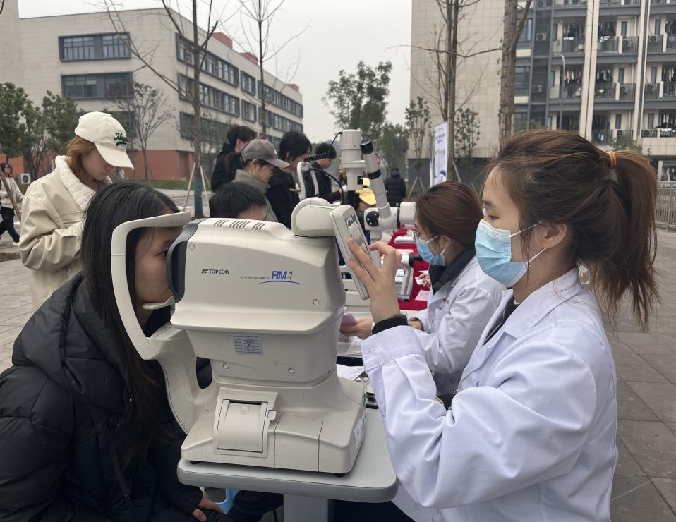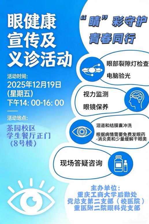 2025年12月19日,后勤处党总支第二支部(校医院)联合重庆医科大学附属第二医院眼科党支部,以“‘睛’彩守护,青春同行”为主题,在茶园校区开展了爱眼护眼宣传教育活动。党员同志们为茶园校区的师生提供了多种服务:一是免费眼部基础检查,早期筛查近视、干眼症、结膜炎、白内障等常见眼病并给出针对性诊疗建议;二是普及科学护眼知识,纠正不良用眼习惯,提升师生眼部健康自我管理意识;三是泪道冲洗和眼镜保养。